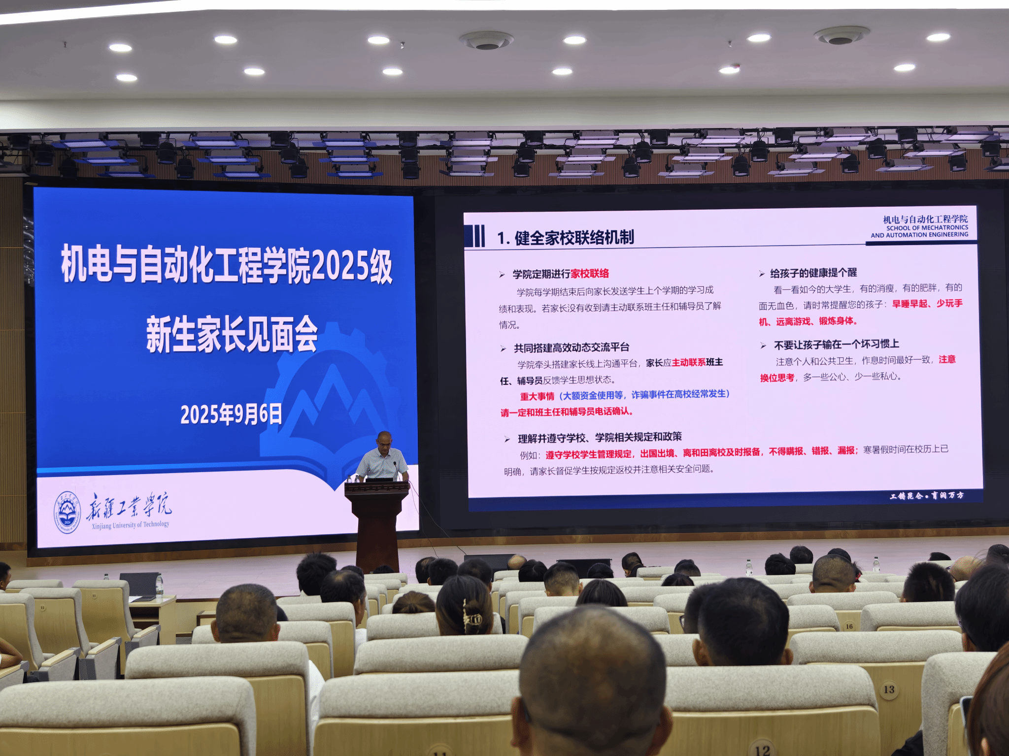 9月6日下午,机电与自动化工程学院在A3-101学术报告厅召开2025级新生家长见面会。学院党委书记蒋奇、院长李小号、党委副书记陈建帮以及各专业负责人、学工办主任、辅导员和全体班主任出席会议,与300余名新生家长围绕学生培养和家校协同等议题进行了深入交流。见面会由2025级新生辅导员杨娜主持。