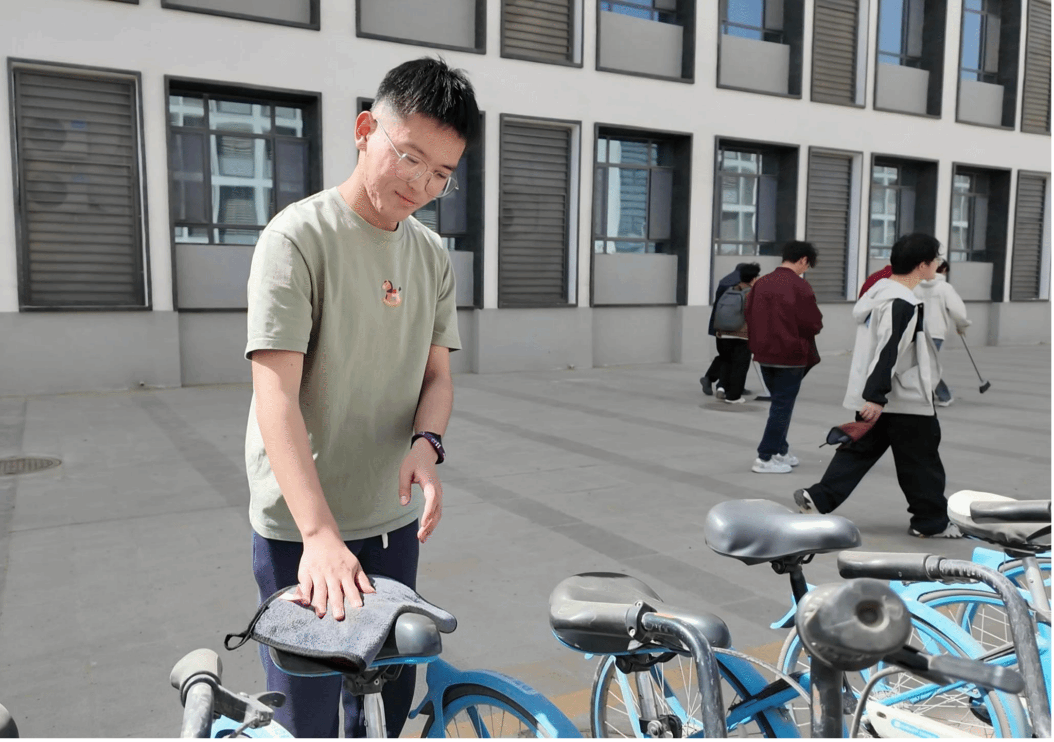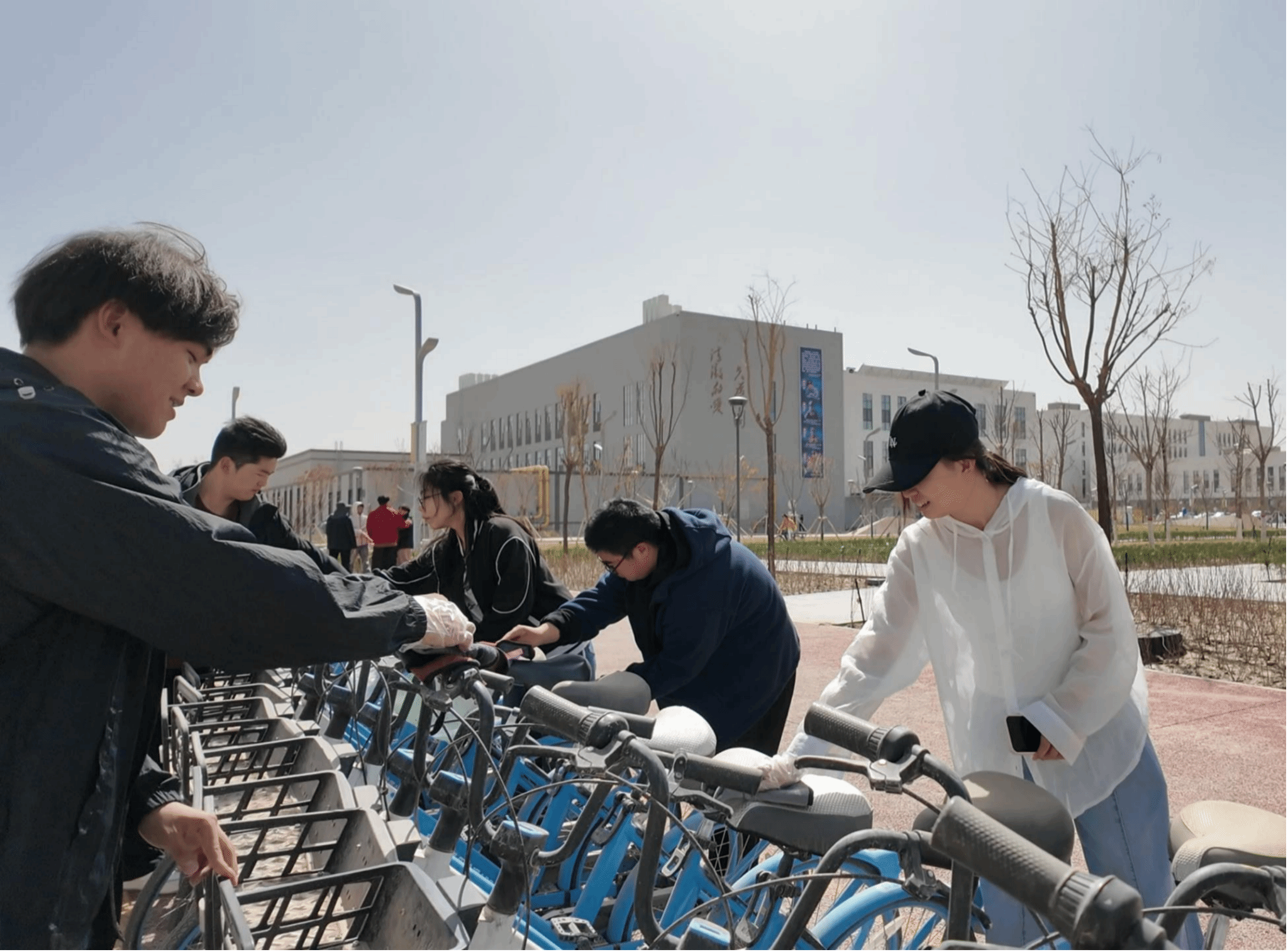 本次活动覆盖学校北门、昆仑之眼、榴园宿舍楼、体育馆沿线、共享单车。活动现场,志愿者们分工协作、干劲十足。路面清洁小组清扫道路两侧落叶、烟头、纸屑;绿化带清理小组俯身捡拾灌木丛中的白色垃圾;公共设施清洁小组擦拭共享单车、垃圾桶等设施污渍。针对昆仑之眼、体育馆周边等重点区域,大家集中攻坚,彻底清理卫生死角。
